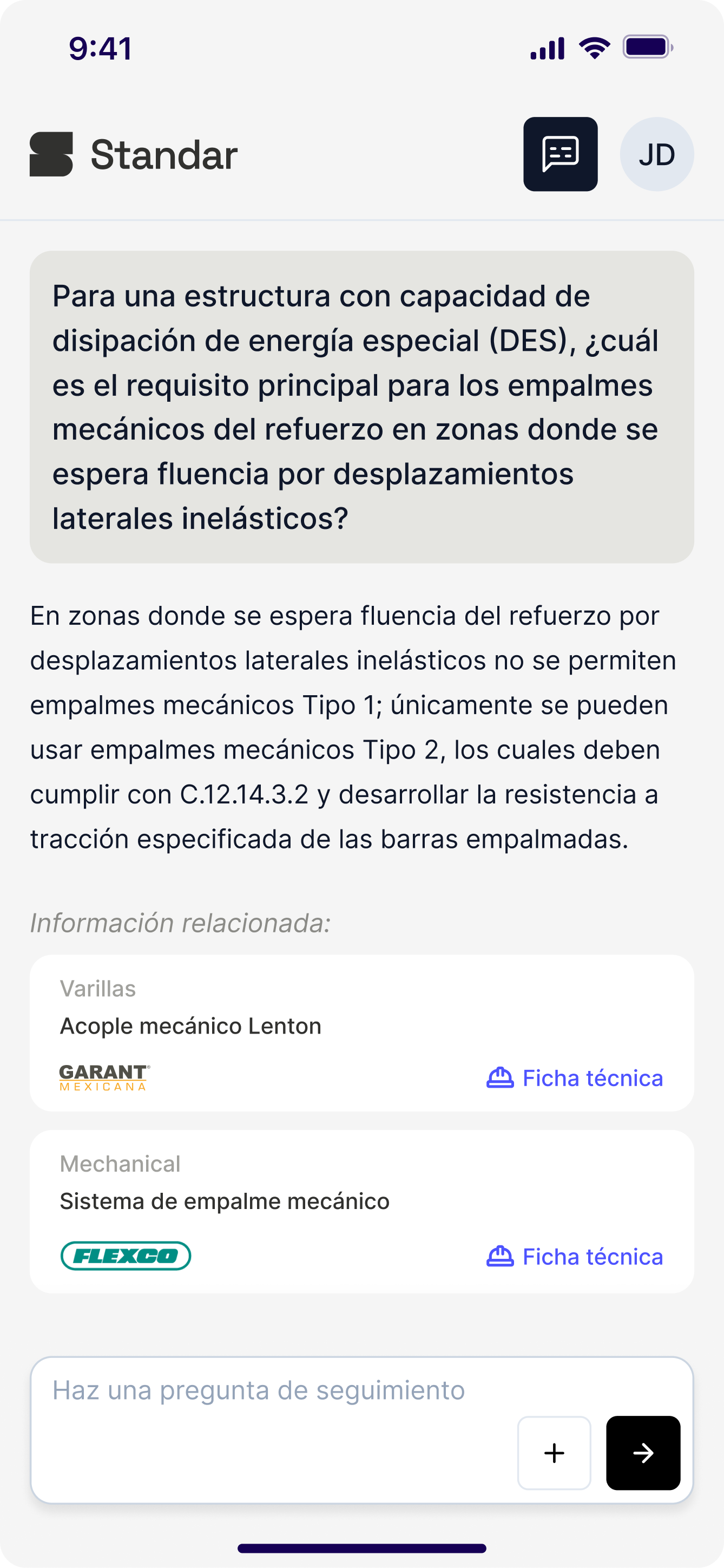 Standar.ai interpreta la normativa de construcción de tu país para ofrecer soluciones técnicas y aplicables en obra, siempre dentro del marco regulatorio.